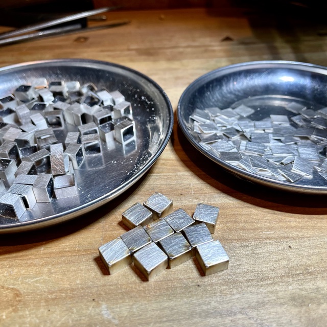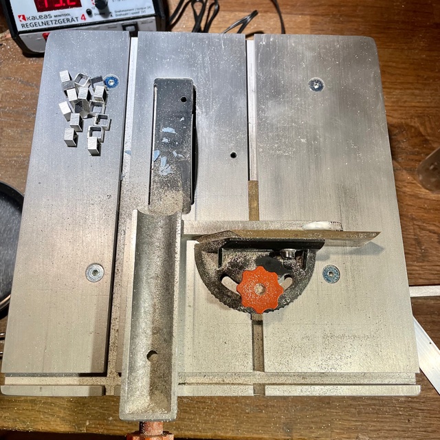 På sågbordet delar jag upp ett 8 x 8 mm fyrkantigt silverrör